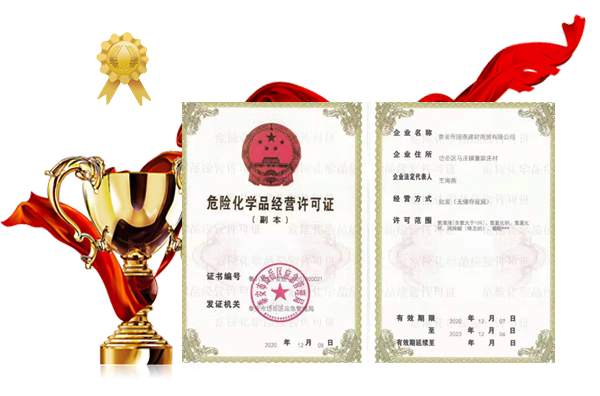 泰安市國(guó)燕建材商貿(mào)有限公司取得危險(xiǎn)化學(xué)品經(jīng)營(yíng)許可證。具有成熟穩(wěn)定的供貨渠道和經(jīng)驗(yàn),與多家企業(yè)建立了長(zhǎng)期穩(wěn)定的合作伙伴關(guān)系,貨源穩(wěn)定、品質(zhì)如一。
